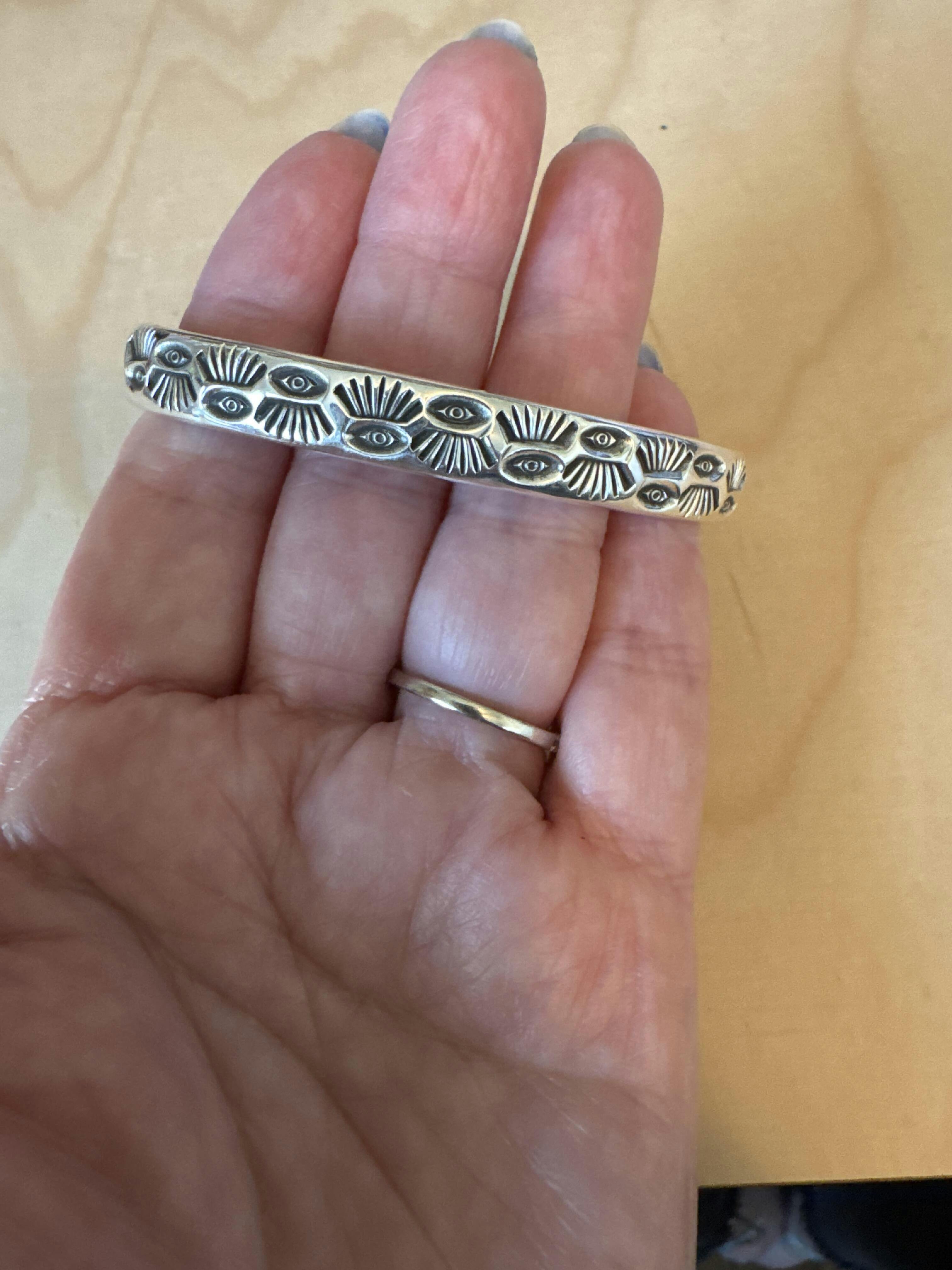 Another beautiful piece to add to my growing collection. Thick silver, beautiful stamping, fits comfortably. Just beautiful. Thank you!